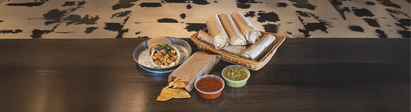 Chili-braised chicken, shredded romaine, Calrose rice, Romano beans, salsa Roja, radish pico, pico de Serrano, Monterey Jack cheese, burst of herbs, tortilla